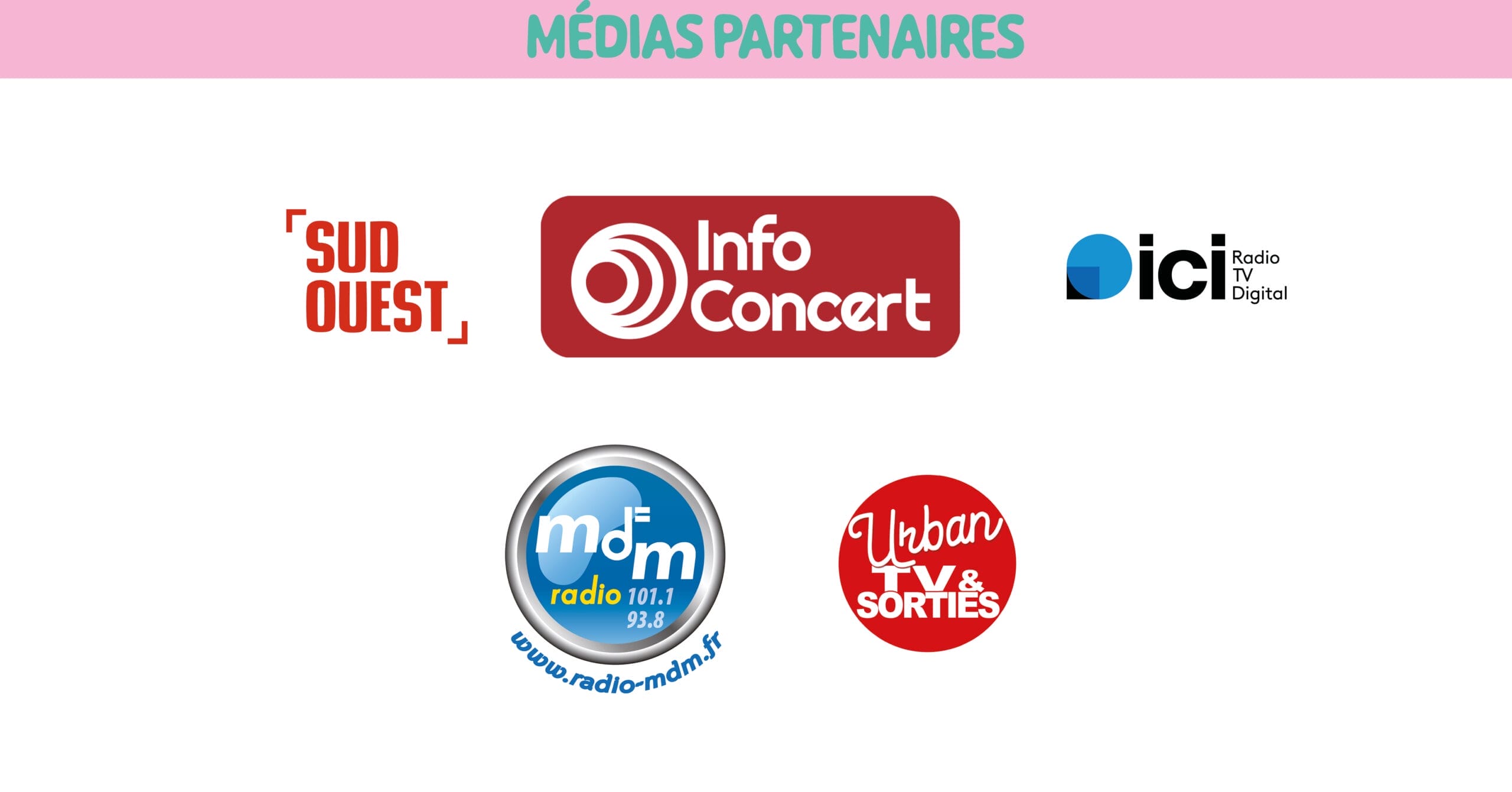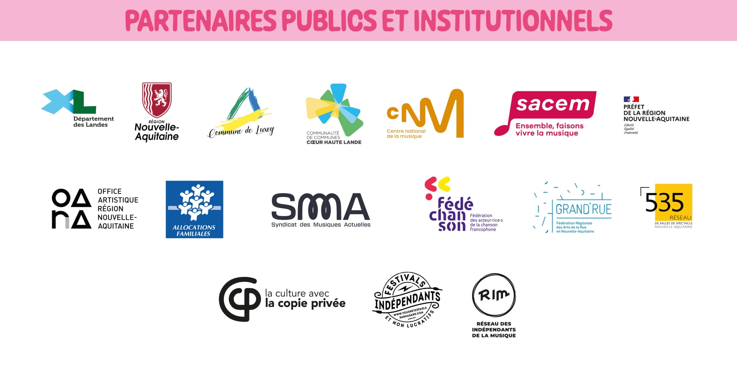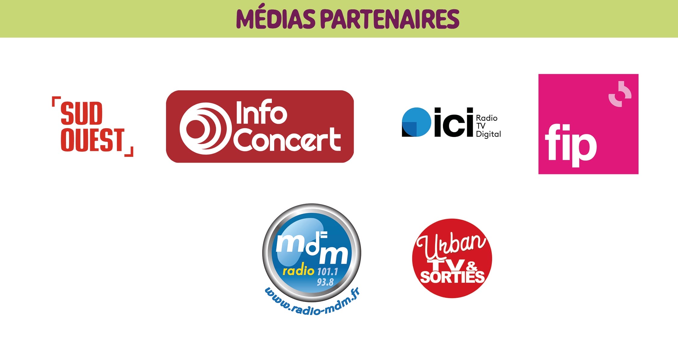 ARPÈGES et TRÉMOLOS – BASTID’Art – BORDEAUX CHANSON – CAFÉMUSIC’ – CHANTONS SOUS LES PINS – C.R.A.C – ÉCO-LIEU JEANOT / HAPCHOT – ESPACE D’ALBRET – ENTRACTE – FÉDÉRATION DES CERCLES DE GASCOGNE – FESTIVAL OUVRE LA VOIX (ROCK SCHOOL BARBEY) – I.D.D.A.C / LES P’TITES SCÈNES – JM FRANCE – L’ACCORDEUR – LANDES MUSIQUES AMPLIFIÉES – LES OISEAUX DE PASSAGE – LES Z’ARPÈTES – LOS BAMBASITOS – MUSICALARUE – MUSICK À L’AVANCE – MUSIK À PILE – NUITS ATYPIQUES – PARC NATUREL RÉGIONAL DES LANDES DE GASCOGNE – SAC DE BILLES (CAFÉ BOISSEC) – SCÈNE AUX CHAMPS – SUNSKA FESTIVAL / SOULBEATS MUSIC – TRANS’ MUSICALE – UN P’TIT VERS DE DROPT – XL TOUR – LA FRAYSE EN CULTURE – DU ROCK MON POTE – LA LOCOMOTIVE (TARNOS) – MUSICARAVANE
